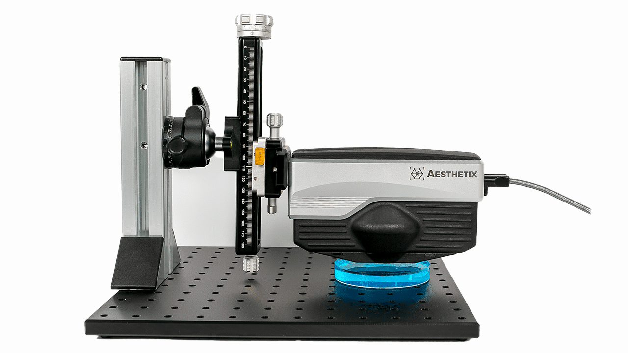 Für die berührungslose Messung von empfindlichen Oberflächen, flüssigen Beschichtungen, Gelen, Cremes und Pasten kann Aesthetix® mit einem höhenverstellbaren Stativ verwendet werden.